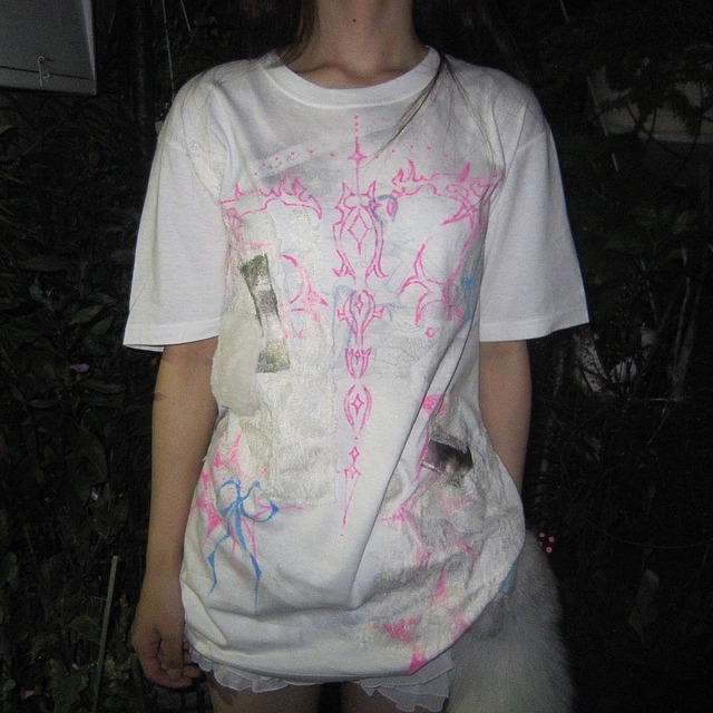幽泳Tシャツの上にひとつひとつリメイク加工をしたTシャツです。 リメイクが重めのハードタイプ 軽めで幽泳プログラムのデザインが見えるソフトタイプの2種類をご用意しています(๑˃̵ᴗ˂̵)♡ 未配信楽曲を一曲、QRコードを同封しています★ ★サイズ★ M 着丈70cm 袖丈20cm 身幅52cm L 着丈74cm 袖丈22cm 身幅55cm XL 着丈78cm 袖丈24cm 身幅58cm 1枚目着用→L ハード 2枚目着用→L ソフト 4枚目着用→M ハード